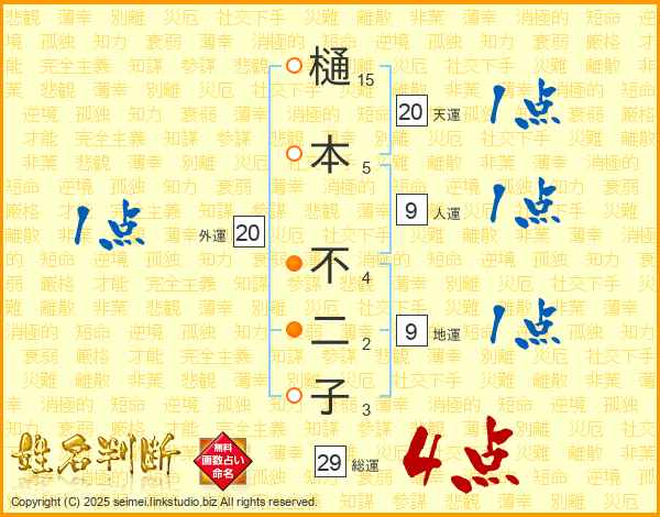 樋(15画)本(5画) 不(4画)二(2画)子(3画)