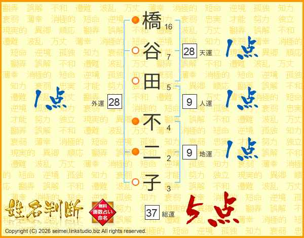 橋谷田不二子さんの総運は37画の5点!