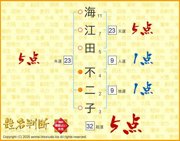 海(11画)江(7画)田(5画) 不(4画)二(2画)子(3画)