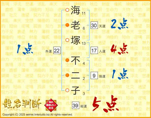 海(11画)老(6画)塚(13画) 不(4画)二(2画)子(3画)