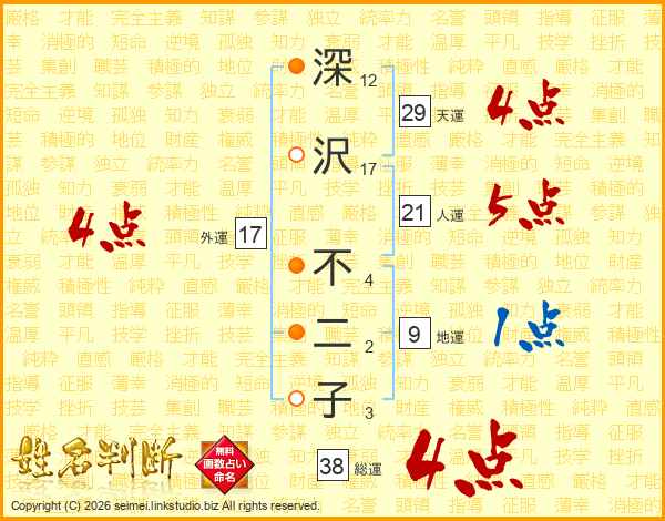 深(12画)沢(17画) 不(4画)二(2画)子(3画)