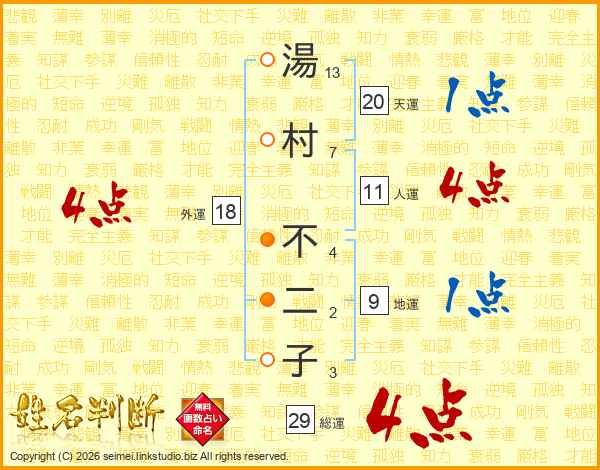 湯(13画)村(7画) 不(4画)二(2画)子(3画)