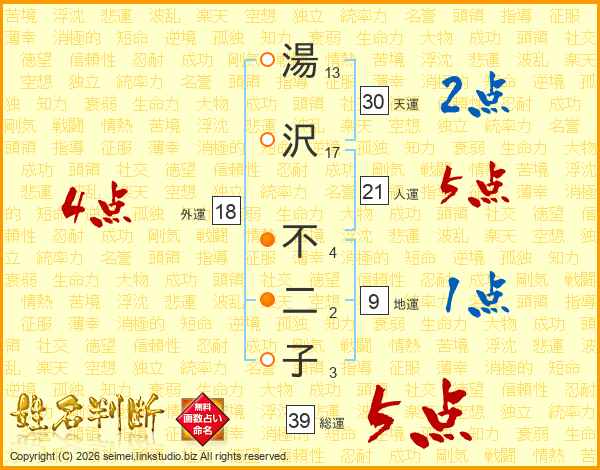 湯(13画)沢(17画) 不(4画)二(2画)子(3画)