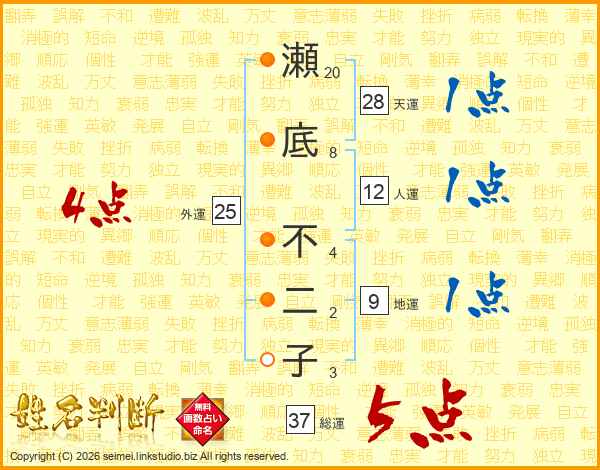 瀬(20画)底(8画) 不(4画)二(2画)子(3画)