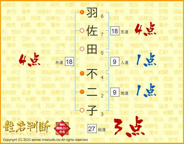 羽(6画)佐(7画)田(5画) 不(4画)二(2画)子(3画)