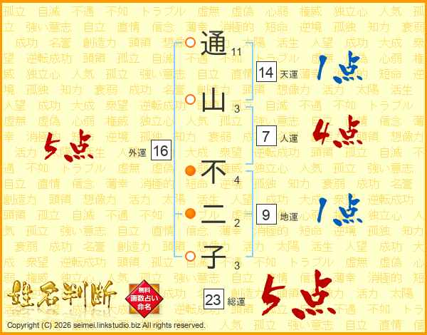 通(11画)山(3画) 不(4画)二(2画)子(3画)