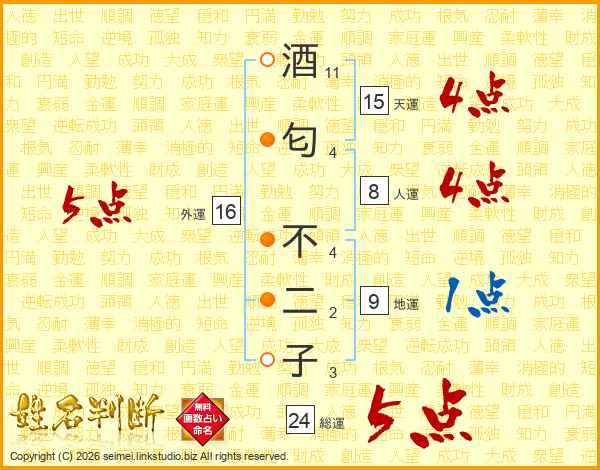 酒(11画)匂(4画) 不(4画)二(2画)子(3画)