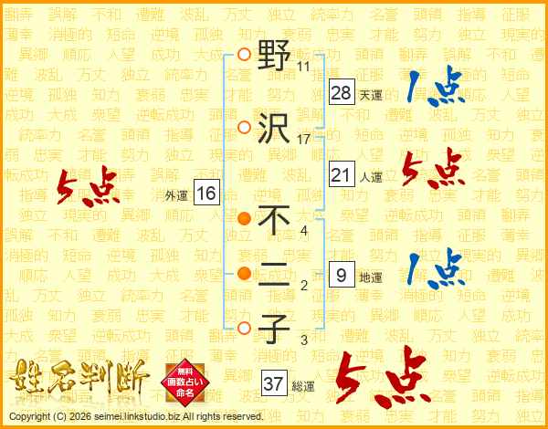 野(11画)沢(17画) 不(4画)二(2画)子(3画)