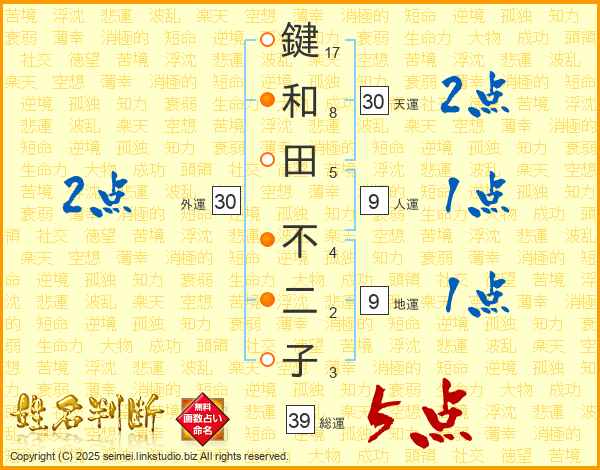 鍵(17画)和(8画)田(5画) 不(4画)二(2画)子(3画)