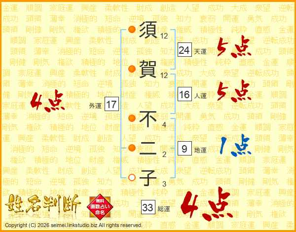 須(12画)賀(12画) 不(4画)二(2画)子(3画)