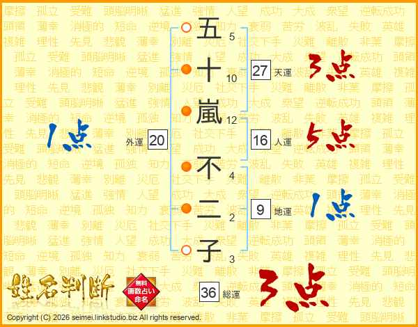 五十嵐不二子さんの天運は27画の3点!