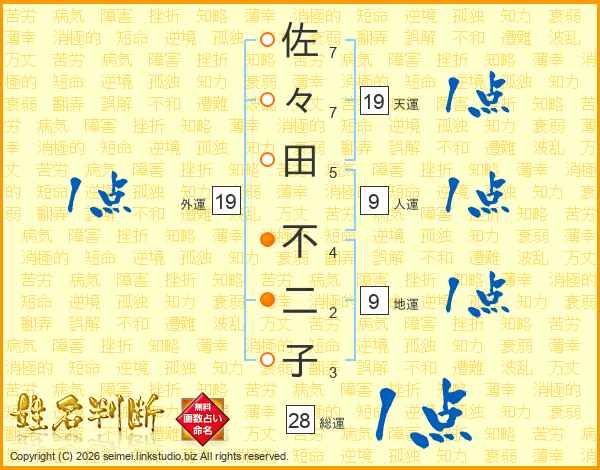 佐(7画)々(7画)田(5画) 不(4画)二(2画)子(3画)