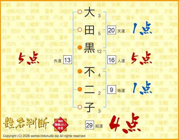 大(3画)田(5画)黒(12画) 不(4画)二(2画)子(3画)