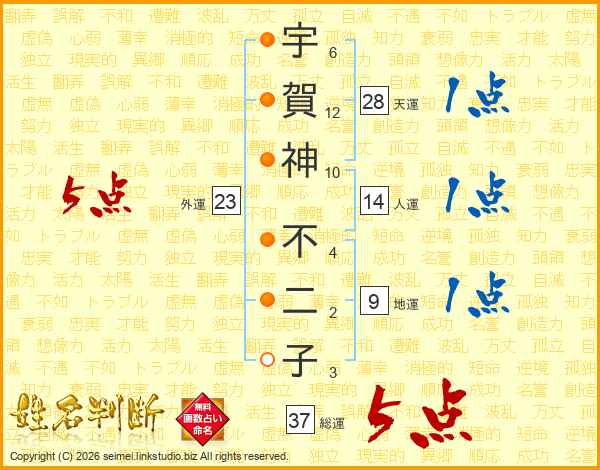 宇(6画)賀(12画)神(10画) 不(4画)二(2画)子(3画)