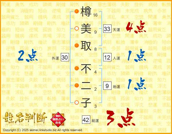 樽(16画)美(9画)取(8画) 不(4画)二(2画)子(3画)