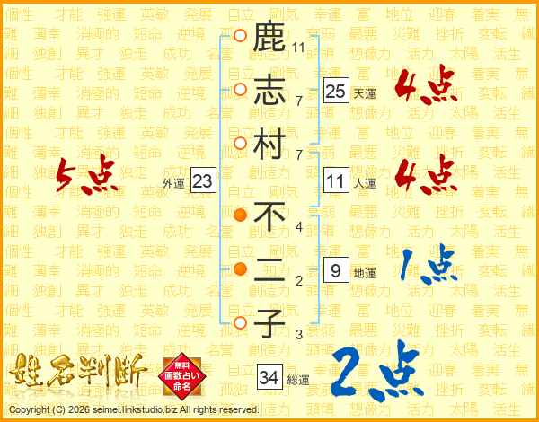 鹿(11画)志(7画)村(7画) 不(4画)二(2画)子(3画)