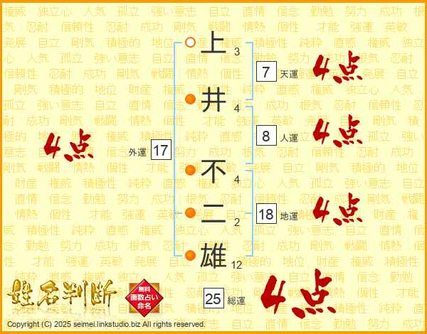 上井不二雄さんの総運は25画の4点!