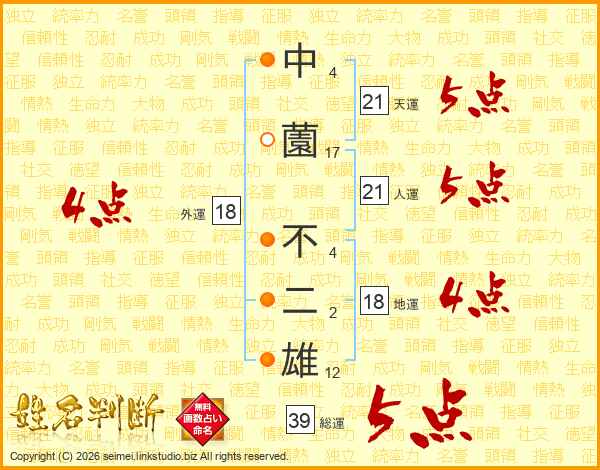 中薗不二雄さんの総運は39画の5点!
