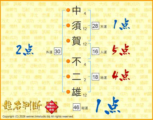 中(4画)須(12画)賀(12画) 不(4画)二(2画)雄(12画)