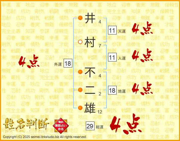 井(4画)村(7画) 不(4画)二(2画)雄(12画)