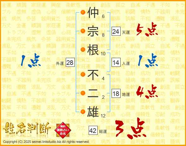 仲(6画)宗(8画)根(10画) 不(4画)二(2画)雄(12画)