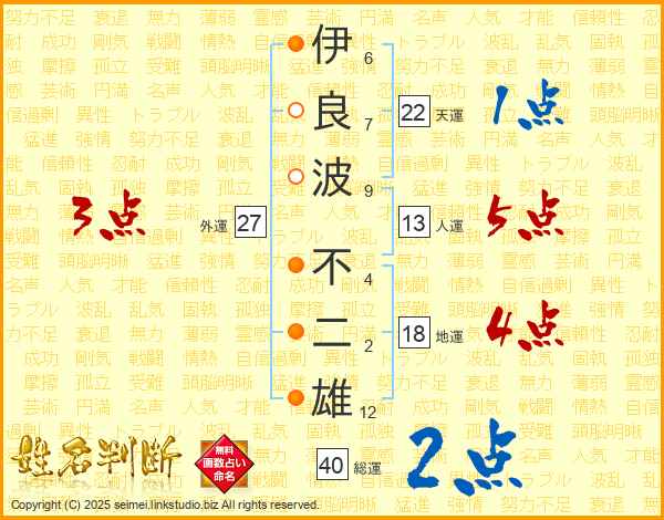 伊(6画)良(7画)波(9画) 不(4画)二(2画)雄(12画)