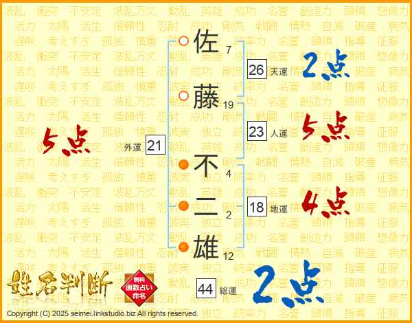 佐(7画)藤(19画) 不(4画)二(2画)雄(12画)