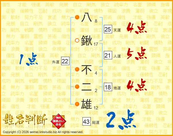 八(8画)鍬(17画) 不(4画)二(2画)雄(12画)