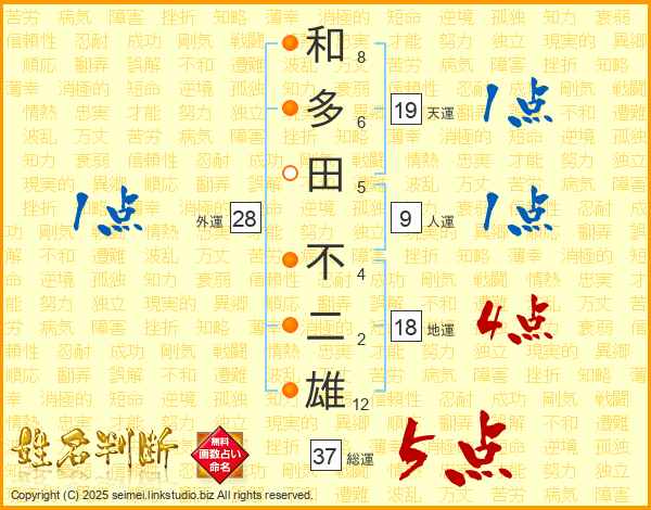 和(8画)多(6画)田(5画) 不(4画)二(2画)雄(12画)