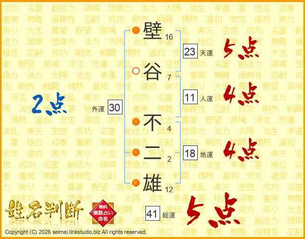 壁(16画)谷(7画) 不(4画)二(2画)雄(12画)