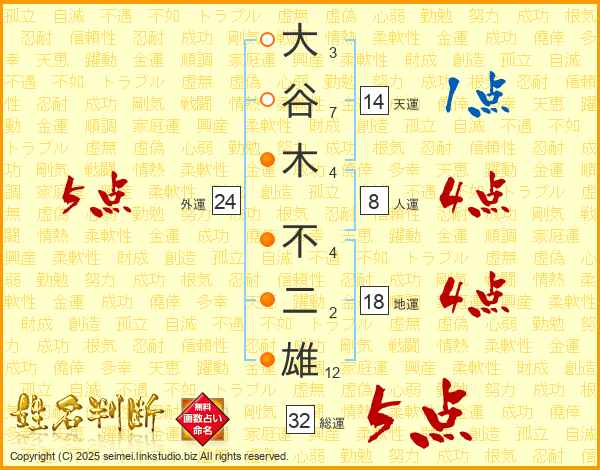 大(3画)谷(7画)木(4画) 不(4画)二(2画)雄(12画)
