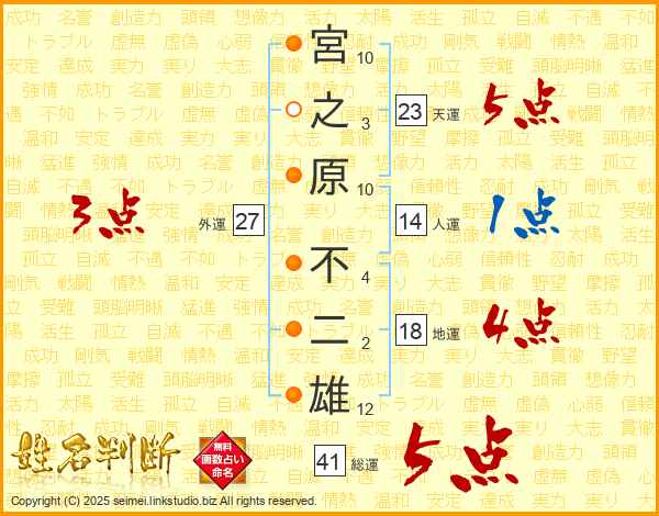 宮(10画)之(3画)原(10画) 不(4画)二(2画)雄(12画)