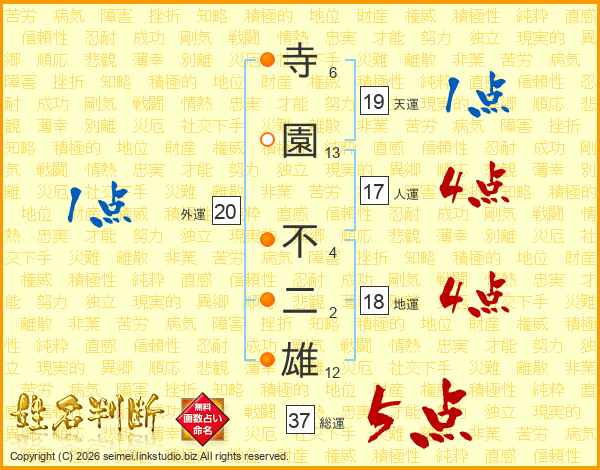 寺園不二雄さんの総運は37画の5点!