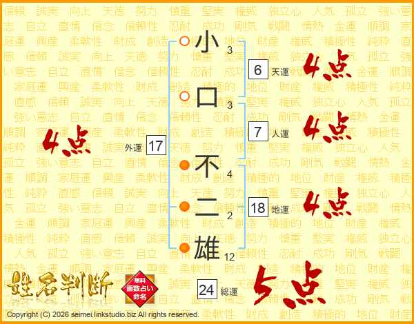 小(3画)口(3画) 不(4画)二(2画)雄(12画)
