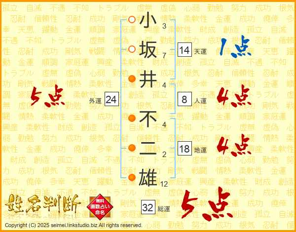 小(3画)坂(7画)井(4画) 不(4画)二(2画)雄(12画)