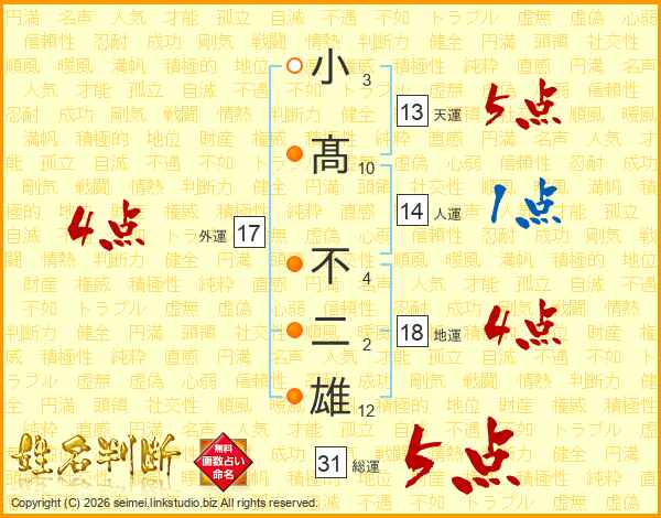 小(3画)髙(10画) 不(4画)二(2画)雄(12画)