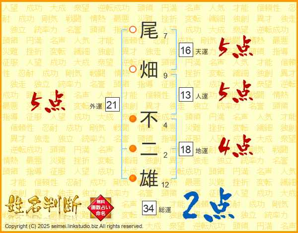 尾(7画)畑(9画) 不(4画)二(2画)雄(12画)