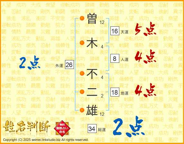 曽(12画)木(4画) 不(4画)二(2画)雄(12画)