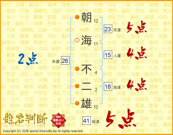 朝(12画)海(11画) 不(4画)二(2画)雄(12画)