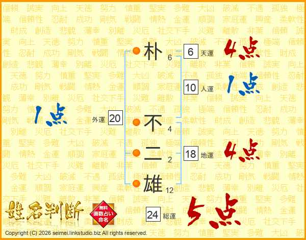 あなたの人生を表す1番重要な運勢です。生涯を通じて影響する総合運となり、主に50歳以降の晩年期に影響を及ぼします。苗字と名前の合計画数。
