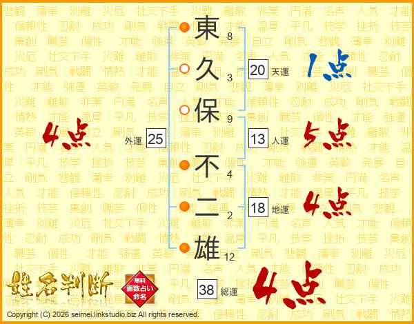 東久保不二雄さんの総運は38画の4点!