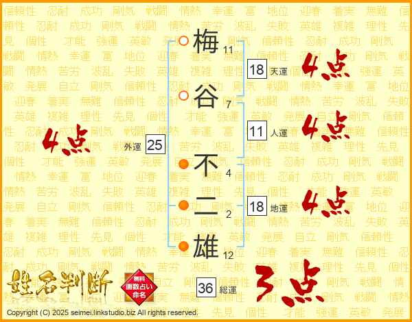 梅(11画)谷(7画) 不(4画)二(2画)雄(12画)