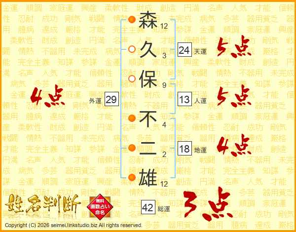 森(12画)久(3画)保(9画) 不(4画)二(2画)雄(12画)