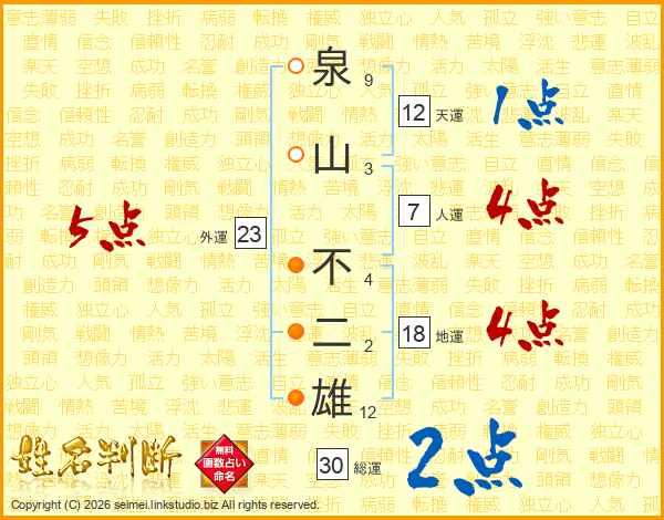 泉(9画)山(3画) 不(4画)二(2画)雄(12画)