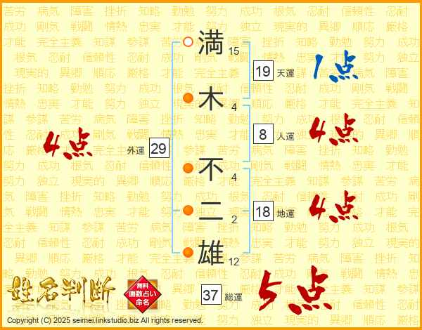 満(15画)木(4画) 不(4画)二(2画)雄(12画)