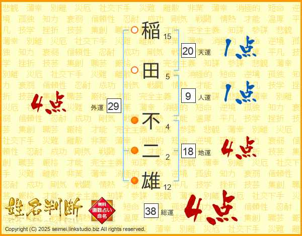 稲(15画)田(5画) 不(4画)二(2画)雄(12画)