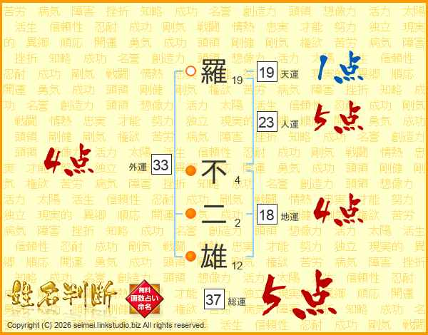 あなたの人生を表す1番重要な運勢です。生涯を通じて影響する総合運となり、主に50歳以降の晩年期に影響を及ぼします。苗字と名前の合計画数。