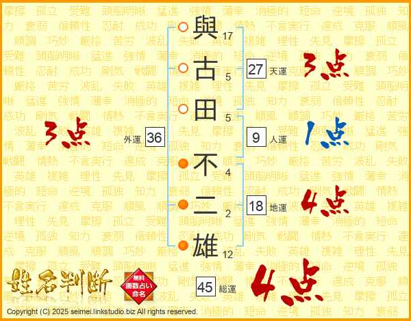 與(17画)古(5画)田(5画) 不(4画)二(2画)雄(12画)