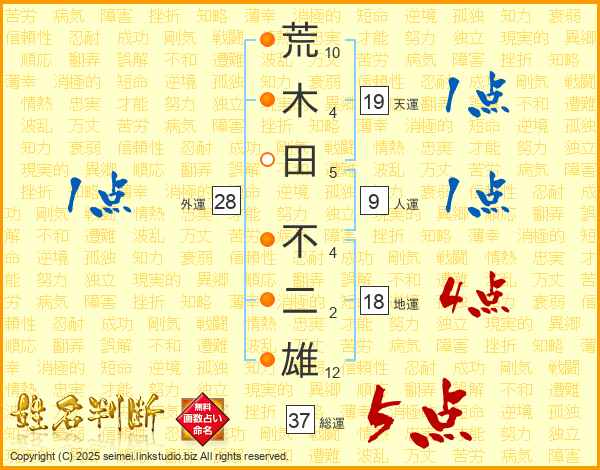 荒(10画)木(4画)田(5画) 不(4画)二(2画)雄(12画)