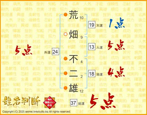 荒(10画)畑(9画) 不(4画)二(2画)雄(12画)